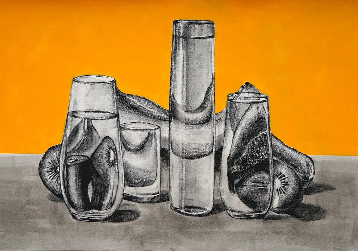 charcoal and acrylic paint on paper and canvas