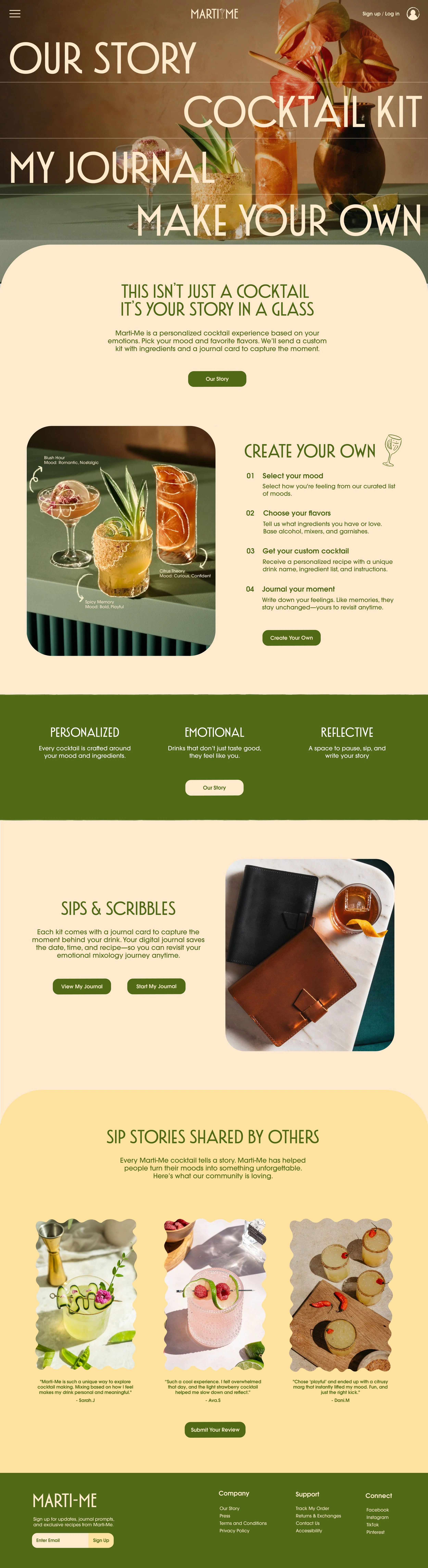 Marti-Me is a conceptual cocktail brand that blends mixology, digital journaling, and self-reflection. The project explores how emotions can be expressed and understood through the symbolic act of creating, naming, and saving personalized cocktails. By designing both the brand identity and user experience, Marti-Me invites users to turn feelings like anxiety, inspiration, or nostalgia into tangible, memorable experiences.